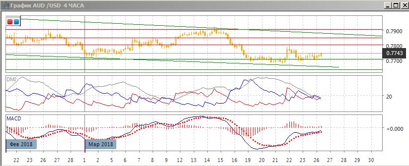 На четырёхчасовом графике нейтральная ситуация: относительные максимумы снижаются, но относительные минимумы растут. По индикаторам направленного движения тенденции также нет: DM+ и DM- близки, гистограмма MACD остаётся немного выше нуля. Более узкой границей консолидации с 22 марта является 0,7700-0,7740. Скорее, дальнейшее более значительное движение будет в сторону выхода из этого диапазона (до 0,7800 если вверх и до нижней границы канала если вниз). Внутри диапазона предпочтительно снижение к нижней границе, так как пара приблизилась к верхней.