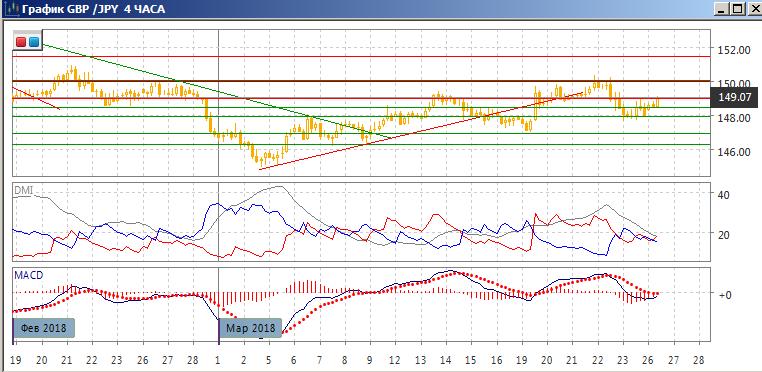 На четырёхчасовом графике пара получила поддержку на 148,00, после тестирования уровня 23 марта пара выросла. С начала марта последовательный рост пары в целом продолжается. Однако после резкого снижения от 150,00 текущая консолидация выше 148,00 может быть как разворотом к 150,00, так и продолжение нисходящего движения к 147,00. По индикаторам направленного движения нейтральная ситуация: DM+ и DM- равны, гистограмма MACD растёт при отрицательном наклоне линии MACD. В консолидации 148,00-149,00 более вероятно снижение к нижней границе. При преодолении уровня 149,00 следующей целью стал бы уровень 150,00.