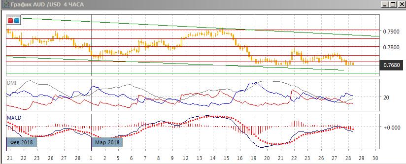 На четырёхчасовом графике пара преодолела уровень поддержки 0,7700, в начале вторника он выступил уже сопротивлением при тестировании его снизу. Пара продолжает находиться ниже относительных минимумов 23 марта, и последовательность роста относительных минимумов с 21 марта нарушена. По индикаторам направленного движения тенденцией становится снижение: DM- выше DM+, гистограмма MACD снижается в отрицательной зоне, линия MACD получила отрицательны наклон. Снижение ниже текущего уровня вывело бы пару ниже минимумов 19-21 марта, после чего поддержки в краткосрочном масштабе не видно, что может ускорить снижение.