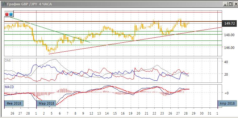 На четырёхчасовом графике продолжается тестирование уровня сопротивления 150,00. Прорывы выше 21, 22, 26-27 марта были краткосрочными. Преодоление этого уровня открывает пространство для движения к следующему уровню сопротивления на 151,50. При откате поддержка может быть на уровне 148,50, это совпадает с линией восходящего тренда. По индикаторам направленного движения флэт: DM+ и DM- близки, гистограмма MACD колеблется около нуля, линия MACD также колеблется.
