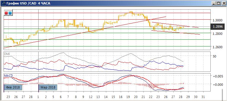 На дневном графике снижение пары после закрытия ниже линии восходящего тренда с начала февраля снижение продолжилось, и пара приблизилась во вторник к «круглому» уровню 1,2800, это был уровень поддержки в середине марта. Закрытие ниже этого уровня показало бы, что картина разворота сформирована. Пока последовательность роста относительных максимумов и минимумов пары не нарушена. По ADX пара перешла к нейтральному состоянию. По гистограмме MACD и линии MACD — перешла к снижению. Закрепление пары ниже линии тренда с начала февраля скорее делает более вероятным продолжение снижения.