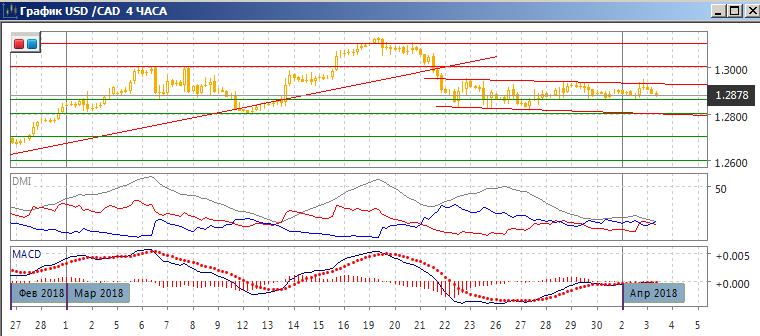 На четырёхчасовом графике пара остаётся с нисходящем канале с 22 марта. После тестирования верхней границы с образованием свечей «падающая звезда» пара снизилась, и приближается к уровню поддержки на 1,2865 (относительные минимумы с 28 марта). Преодоление этого уровня открыло бы пространство для дальнейшего снижения к 1,2800. По индикаторам направленного движения в этом масштабе флэт: DM+ и DM- близки, гистограмма MACD около нуля, линия MACD почти горизонтальна.