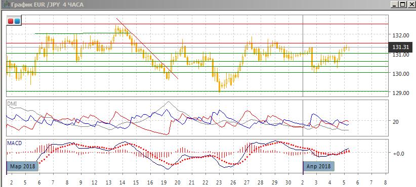 На четырёхчасовом графике пара преодолела максимум начала апреля, но немного выше находится сильное сопротивление на 131,50, рост ниже которого приостановился, и высока вероятность отката вниз, так как текущая волна роста не является сильной. Относительные максимумы и минимумы пары сейчас растут. С целом пара остаётся в боковом движении с начала марта, и так как пара в верхней части диапазона, в рамках движения в диапазоне предпочтительно снижение к нижней границе (первоначально к 130,00).