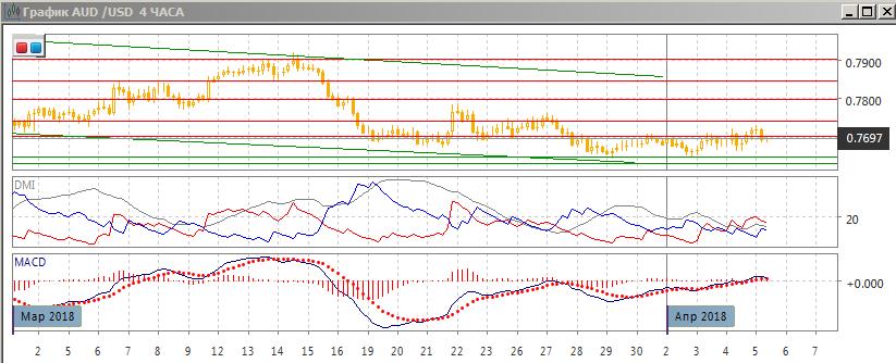На четырёхчасовом графике пара перешла к росту и продолжается последовательный рост от 0,7645. По индикаторам направленного движения рост стал слабой тенденцией: DM+ выше DM-, хотя ADX на низком уровне, гистограмма MACD немного выше нуля. Преодоление уровня 0,7700 говорит о существенной поддержке для отскока, и потенциале его продолжения. Ранее этого уровень часто выступал поддержкой/сопротивлением. Также это показывает, что пара преодолела уровень промежуточной вершины двойного дна на 0,7645. В это масштабе дальнейший рост кажется предпочтительным с ближайшей целью на 0,7740.