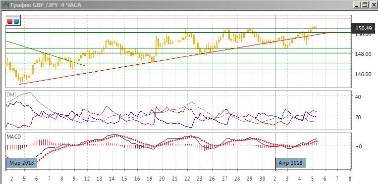 На дневном графике пара восстановилась, и закрытие во вторник было выше линии восходящего тренда с начала марта. Последовательно роста относительных максимумом и минимумов пары сохраняется. Пара достигла более высокого максимума , чем в конце марта и в среду образовался «молот» с закрытием выше 150,00, что увеличивает вероятность дальнейшего движения вверх. По индикаторам направленного движения тенденцией остаётся рост: DM+ выше DM-, гистограмма MACD остаётся в положительной зоне, линия MACD сохраняет положительный наклон. При этом образовалось медвежье расхождение максимумов пары и гистограммы MACD, что при откате обратно ниже 150,00 и ниже линии тренда стало бы сигналом разворота.