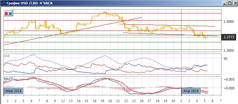 На четырёхчасовом графике пара вышла вниз из нисходящего канала с 22 марта, выход вниз предполагает продолжение снижения пары. Относительные максимумы и минимумы пары сейчас последовательно снижаются. По ADX тенденция снижения усиливается: превышение DM- над DM+ увеличивается при росте ADX. Закрепление ниже уровня минимума 12 марта и минимумов 22-27 марта открывает возможность дальнейшего снижения пары, так как ближайшей поддержки кроме «круглых» уровней не видно, ближайший это 1,2700, который и видится сейчас целью.