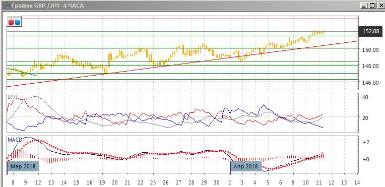 На дневном графике пара преодолела уровень сопротивления на 151,50, закрытие во вторник было выше. До 153,55 (там максимумы начала декабря и начала января) обоснованного сопротивления не видно, что облегчает дальнейший рост. Последовательность роста относительных максимумов и минимумов пары сохраняется. По индикаторам направленного движения тенденция роста усиливается: превышение DM+ над DM- увеличивается, гистограмма MACD остаётся в положительной зоне, линия MACD сохраняет положительный наклон. Пара остаётся выше восходящего тренда с начала марта.