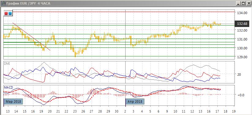 На четырёхчасовом графике последовательный рост продолжается от 130,00. Пара достигла уровня 133,00, преодолев сопротивление на 132,50, и теперь этот уровень выступил поддержкой при откате. Сама тенденция роста замедляется — по индикаторам направленного движения это видно в сокращении превышения DM+ над DM-, переходе линии MACD и гистограммы MACD в соответствующее флэту состояние. Пока картины разворота нет, и более вероятно, что уровень 133,00 будет вновь тестироваться.