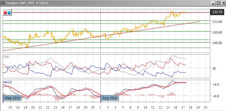 На дневном графике пара достигла уровня сопротивления 153,55 (максимумы начала декабря и начала января). Ситуация остаётся прежней: относительные максимумы и минимумы пары растут, пара остаётся выше линии восходящего тренда с начала марта. По индикаторам направленного движения тенденция роста усиливается: превышение DM+ над DM- увеличивается, ADX на высоком уровне и растёт, гистограмма MACD растёт в положительной зоне, линия MACD сохраняет положительный наклон. Так как замедления тенденции нет и разворота не видно, более вероятно, что рост будет продолжаться, хотя он уже выглядит растянутым (пара растёт от 148,50 без откатов).