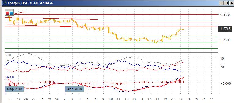 На четырёхчасовом графике пара последовательно растёт, уровень верхней границы консолидации 11-19 апреля 1,2635 при откате выступил поддержкой. По ADX тенденция роста усиливается — превышение DM+ над DM- большое при росте ADX, который на высоком уровне. Пока признаков разворота нет и рост в краткосрочной перспективе кажется более предпочтительным.