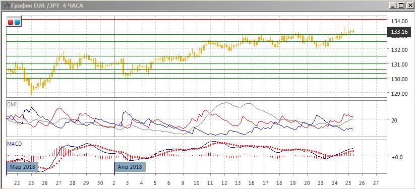 На четырёхчасовом графике пара преодолела уровень 133,00, который тестировался 13-20 апреля, это предполагает, что рост скорее продолжится, исходя из размера диапазона 100 пунктов, из которого пара вышла вверх, целью соответствует уровню сопротивления 134,00.