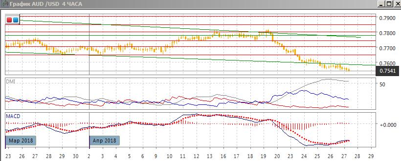 На дневном графике продолжается снижение без отскоков от 0,7800, пара приближается к психологически важному уровню 0,7500. Около текущего уровня 0,7540 был относительный минимум ноября. Последовательность снижения относительных максимумов и минимумов пары сохраняется. По индикаторам направленного движения тенденцией является снижение: DM- значительно выше DM+, ADX растёт, гистограмма MACD снижается в отрицательной зоне, линия MACD имеет отрицательный наклон. Пара находится у уровня перепроданности по RSI. Вместе с приближением к психологически важному уровню 0,7500 и длительному периоду снижения без отскоков это увеличивает вероятность отскока вверх от 0,7500.