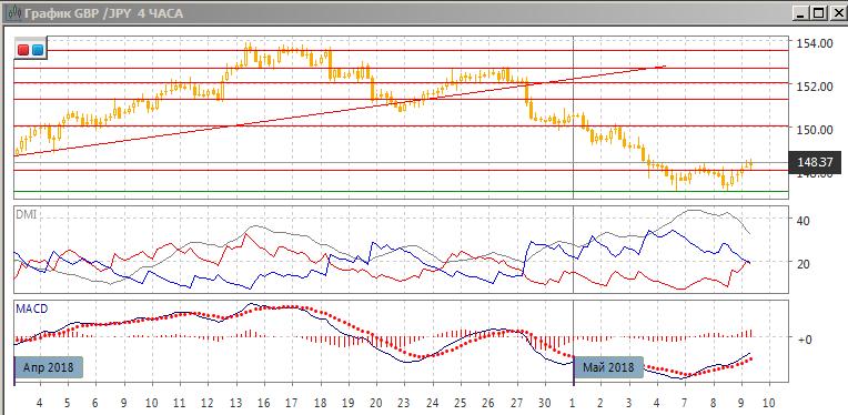 На дневном графике ситуация произошёл небольшой отскок от уровня поддержки на 147,30, что соответствует относительному минимуму 19 марта. Во вторник образовался «молот», в среду он может быть подтверждён если будет свеча роста (при этом пара закрылась бы выше 148,00). Вне зависимости от возможного коррекционного движения вверх, в целом тенденция снижения остаётся сильной. Последовательность снижения относительных минимумов и максимумов пары не нарушена. Так как пара снизилась ранее сильнее чем уровень коррекции 61,8% к волне роста марта — середины апреля, продолжение снижения остаётся с этой точки зрения предпочтительным. По индикаторам направленного движения тенденция снижения остаётся сильной: превышение DM- над DM+ большое, ADX на высоком уровне и растёт, гистограмма MACD остаётся в отрицательной зоне, линия MACD имеет отрицательный наклон.