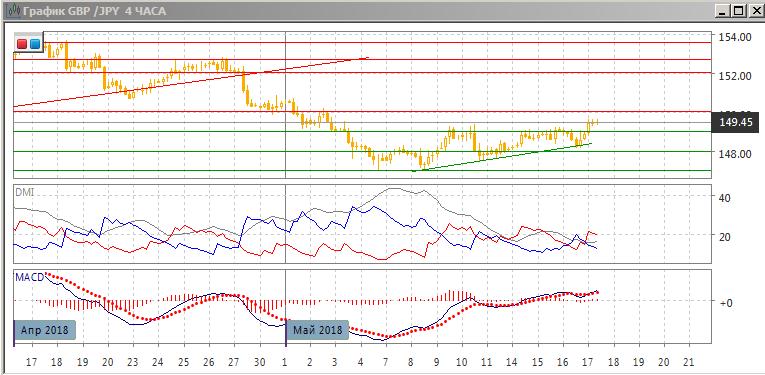 На четырёхчасовом графике выход пары из треугольника, образованного уровнем 149,00 и восходящим трендом с 8 мая. Преодоление парой уровня 149,00, который долго тестировался, предполагает возможность дальнейшего краткосрочно роста, ближайшей целью видится уровень 150,00, где также может быть сильное сопротивление.