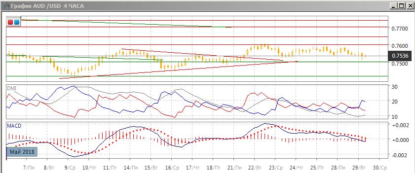 На четырёхчасовом графике пара остаётся в диапазоне 0,75-0,76, пара достигла уровня предыдущих минимумов 24 и 25 мая. Однако скорее снижение продолжится до 0,7500 и этот уровень будет тестироваться. По индикаторам направленного движения снижение является слабой тенденцией: ADX на очень низком уровне, краткосрочно снижение гистограммы MACD в отрицательной зоне и отрицательный наклон линии MACD показывают краткосрочную тенденцию снижения.