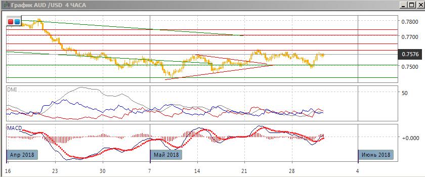 На четырёхчасовом графике пара ниже верхней границы диапазона 0,75-0,76, возможно, образовалась новая вершина, и продолжение движения выше 0,7600 не кажется сейчас вероятным. По индикаторам направленного движения флэт: DM- и DM+ пересекаются, ADX на низком уровне. Гистограмма MACD колеблется около нуля. В рамках движения пары в диапазоне более вероятным кажется снижение к нижней границе на 0,7500.