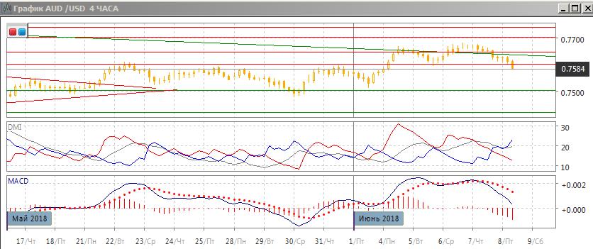 На четырёхчасовом графике произошёл разворот, так как пара преодолела минимум 5 июня и уровень поддержка на 0,7600, что с точки зрения модели двойной вершины является подтверждением. Также это произошло после образования медвежьего расхождения максимумов пары и гистограммы MACD. По индикаторам направленного движения пара перешла к снижению: DM- выше DM+, гистограмма MACD снижается в отрицательной зоне, линия MACD имеет отрицательный наклон.