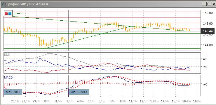 На четырёхчасовом графике пара снижается от 148,00. Ранее преодолённый уровень поддержки на 147,00 выступает сейчас сопротивлением (он ограничил отскок вверх в пятницу). Исходя из двух вариантов (двойная вершина 148,00 или движение в канале), ближайшей целью видится снижение к 146,00. По индикаторам направленного движения снижение — довольно слабая тенденция, скорее показали остаются характерны для движения в диапазоне (сейчас это может быть 146,00-148,00).