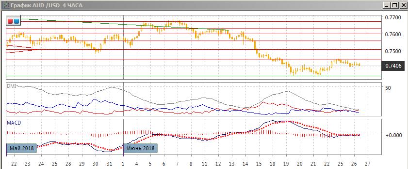 На четырёхчасовом графике, рост пары продолжается: после преодоления уровня промежуточного минимума двойного дна у 0,7400 пара остаётся выше этого уровня и при откате получила на нём поддержку. Это характерно для изменения тенденции на рост. По индикаторам направленного движения в этом масштабе флэт: гистограмма MACD около нуля, DM+ и DM- близки при низком уровне ADX, линия MACD горизонтальна. Пока пара выше 0,7400, возобновление роста кажется предпочтительным. Однако если пара не удержится выше, то далее поддержки ближе минимумов июня у 0,7345 не видно.