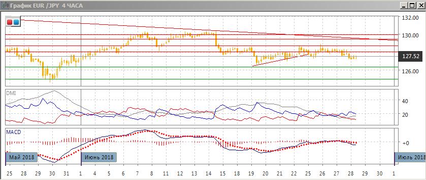 На четырёхчасовом графике произошёл разворот и относительные максимумы и минимумы пары последовательно снижаются. Пара достигла относительного минимума 25 июня. По индикаторам направленного движения тенденцией стало снижение: DM- выше DM+, хотя ADX на низком уровне, линия MACD получила отрицательный наклон. Исходя из снижения от 128,70, где ранее образовалось четыре максимума, и волны снижения после колебаний вокруг 128,00, краткосрочной целью может быть минимум 19 июня около 126,40.