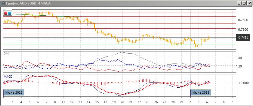На четырёхчасовом графике стабилизация продолжается — пара остаётся около середины диапазона с 18 июня. Относительных максимумы и минимумы сейчас последовательно растут, но это происходит в рамках волны роста от нижней границы диапазона. Рост выше 0,7400 не поддерживается. По индикаторам направленного движения флэт: DM+ и DM- близки при понижении уровня ADX, гистограмма MACD колеблется около нулевого уровня, линия MACD также колеблется. В рамках движения в диапазоне предпочтительным видится рост к 0,7445.