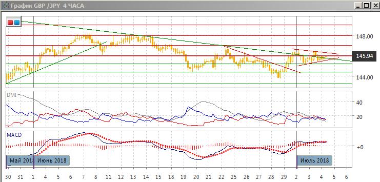 На четырёхчасовом графике пара находится в треугольнике с начала июня. В рамках движения в треугольнике более вероятно движение к верхней границе. Так как треугольник образовался после волны роста, продолжение более вероятно с выходом вверх. По индикаторам направленного движения флэт: DM+ и DM- близки, ADX на низком уровне, гистограмма MACD около нуля, линия MACD почти горизонтальна.
