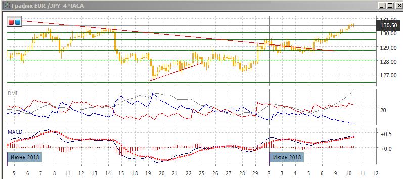 На дневном графике пара продолжила рост после закрытия выше линии тренда 5 июля. При этом пара преодолела предыдущий относительный максимум, и был достигнут максимум июня на зоне сопротивления 130,30. Преодоление этого уровня делает следующей целью уровень 131,35 — на сопротивлении середины мая. Пара перешла к росту: относительные максимумы и минимумы пары растут. По индикаторам направленного движения тенденцией является рост: превышение DM+ над DM- увеличивается, линия MACD сохраняет положительный наклон, гистограмма MACD растёт в положительной зоне. Краткосрочно пар а скорее будет расти к 131,50 — 200-дневной средней.