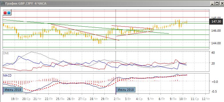 На дневном графике пара достигла нового максимума, и преодолела относительный максимум конца июня. Относительные максимумы и минимумы пары сейчас последовательно растут. По индикаторам направленного движения пара также перешла к росту: DM+ сейчас выше DM-, гистограмма MACD растёт в положительной зоне, линия MACD имеет положительный наклон. Следующий обоснованный уровень сопротивления — на 148,00, около максимумов июня. Скорее, он будет тестироваться.
