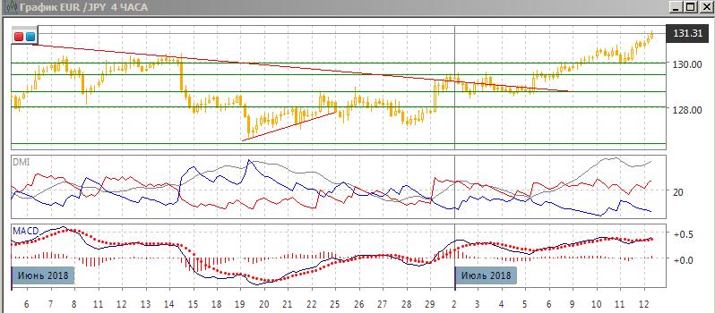 На четырёхчасовом графике вероятность отката видна из-за образования медвежьего расхождения максимумов пары и гистограммы MACD. По RSI новый максимум также не подтвердился. При откате поддержка может у 130,50 (около 20-дневной EMA). По ADX в этом масштабе тенденция роста является сильной, превышение DM+ над DM- большое и устойчивое. В целом продолжение роста видится предпочтительным, даже несмотря на возможный откат.