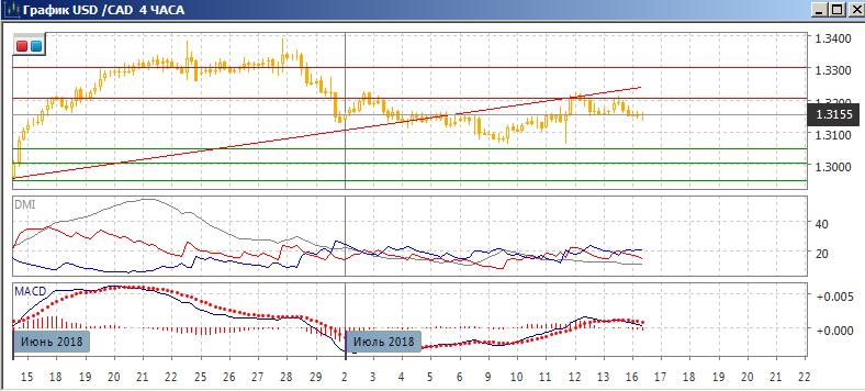 На четырёхчасовом графике у 1,3200 сейчас, возможно, образовалась двойная вершина. Снижение в начале понедельник было ниже промежуточного минимума двойной вершины 12-13 июля. По индикаторам направленного движения в целом тенденции нет (ADX на низком уровне), но более краткосрочно тенденцией является снижение: гистограмма MACD снижается в отрицательной зоне, линия MACD получила отрицательный наклон. Последовательность роста относительных максимумов и минимумов пары нарушена, и сейчас они снижаются. Закрепление пары ниже 1,3150 скорее выводит пару к уровню поддержки на 1,3050, около минимумов 6 и 11 июля.