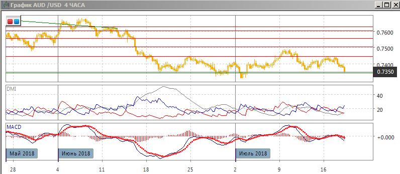 На четырёхчасовом графике пара находится у нижней границы диапазона с середины июня 0,7345-0,7445. Так как движение сейчас не замедляется, а ускоряется, то вероятно нижняя граница диапазона будет тестироваться. Прорыв текущего уровня выводит пару к следующему «круглому» уровню 0,7300, там же находится минимумы начала июля. По индикаторам направленного движения тенденцией является снижение: DM- значительно выше DM+, хотя ADX пока на низком уровне, гистограмма MACD снижается в отрицательной зоне, линия MACD имеет отрицательный наклон. Рассчитывать на продолжение снижения до преодоления нижней границы диапазона, скорее, преждевременно.