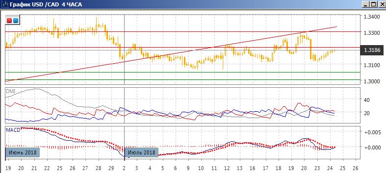 На четырёхчасовом графике пара растёт после снижения к минимумам середины июля у 1,3115. Поддержка на этом уровне была и в начале июля. Пока рост пары остаётся в рамках коррекции к снижению от 1,3300. От сопротивления на 1,3200 пара снижалась в начале и середине июля, поэтому это может быть удобный уровень для возобновление снижения пары после коррекции. По индикаторам направленного движения флэт: DM+ и DM- близки при низком уровне ADX, гистограмма MACD около нуля, наклон линии MACD уменьшается.