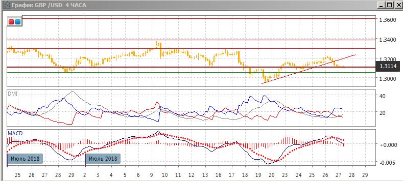 На четырёхчасовом графике пара снижается от сопротивления на 1,3200 и при этом был преодолён краткосрочный восходящий тренд. Произошло это после образования медвежьего расхождения максимумов пары и гистограммы MACD, что подтверждает сигнал. Пара достигла ближайшего «круглого» уровня на 1,3100. Отскока от него нет, и поэтому вероятно пара его преодолеет. Это сделало бы следующей целью «круглый» уровень на 1,3000. По индикаторам направленного движения снижение является слабой тенденцией: DM- выше DM+, но при ADX на низком уровне, гистограмма MACD снижается в отрицательной области, линия MACD имеет отрицательный наклон.