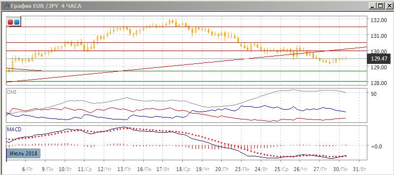 На четырёхчасовом графике происходит небольшой отскок вверх при приближении к уровню 129,00. Он небольшой, образуются свечи «дожи». Пока более вероятным кажется, что снижение возобновится. По ADX в этом масштабе тенденция снижения остаётся сильной — превышение DM- над DM+ большое, ADX на высоком уровне. Новый минимум не подтверждается по MACD, это этот сигнал не имеет подтверждения.