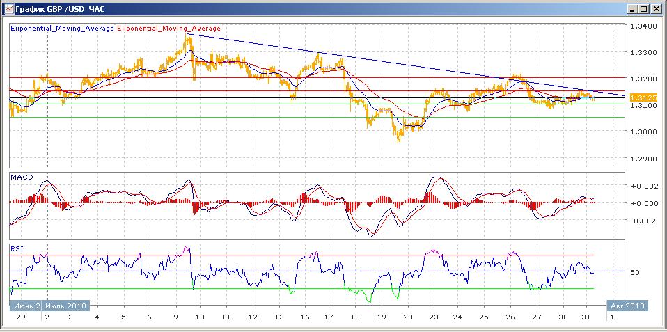 после снижения в прошлый четверг (когда пара не смогла преодолеть нисходящее сопротивление) пара в пятницу закрылась со слабым снижением, закрывшись на 1.3100. вчера торги прошли с умеренным ростом пары, которая протестировала сопротивление на 1.3150 с закрытием на 1.3135. сегодня пара с начала торгов слабо снижается. Средние скользящие ЕМА21 и ЕМА55 пересеклись вниз и готовы к снижению. Индикаторы MAСD и RSI находятся ниже своих центральных линий и сегодня снижаются.