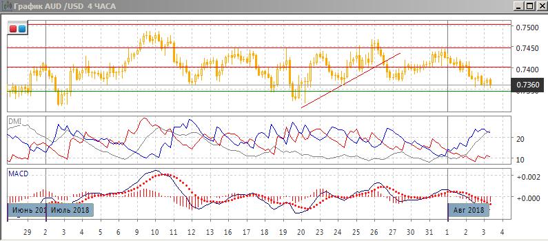 На четырёхчасовом графике пара снижается от 0,7445, и преодолела минимум 26-27 июля. По индикаторам направленного движения снижение стало относительно сильной тенденцией: DM- значительно выше DM+ при росте ADX, гистограмма MACD остаётся в отрицательной зоне, линия MACD имеет отрицательный наклон. На выход ниже нижней границы канала на 0,7345 рассчитывать пока преждевременно, так как отношение риска/выгоды не делает снижение привлекательным.