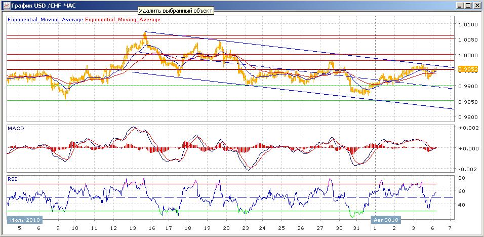 Продолжается движение пары в нисходящем канале. В четверг пара показала умеренный рост и после многократных попыток преодолела сопротивление на 0.9950 с закрытием на 0.9954.в пятницу пара закрылась со слабым снижением на 0.9946, рост в начале сессии уперся в сопротивление от верхней границы канала. Сегодняшние торги проходят со слабым ростом, пара тестирует сопротивление на 0.9950. Средние скользящие ЕМА21 и ЕМА55 направлены вверх и растут. Индикаторы MAСD и RSI находятся выше своих центральных линий и сегодня растут.