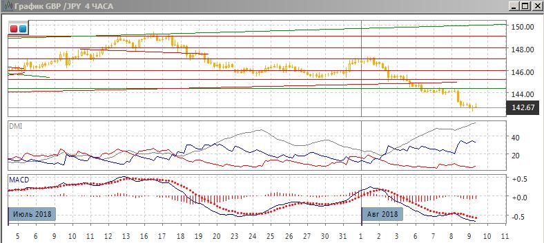 На четырёхчасовом графике также видно, что вероятность отскока вверх повышается: образовалось бычье расхождение минимумов пары и гистограммы MACD, по RSI пара значительно перепроданна. При этом последовательность снижения относительных максимумов и минимумов пары сохраняется, по ADX тенденция снижения очень сильная: DM- значительно выше DM+, ADX на высоком уровне и растёт. При отскоке сопротивление видится на 144,00 — на этом уровне пара встретила поддержку 6-8 августа.