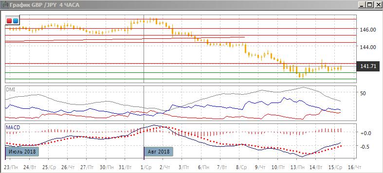 На четырёхчасовом графике коррекция вверх приостановилась ниже 142,00, около этого уровня образовалась «падающая звезда» и пара стабилизируется в узком диапазоне ниже 142,00. Пока пара ниже 142,00, более вероятным видится возобновление снижения. При прорыве выше следующей целью стал был уровень 144, выше которого пара остановилась 6-7 августа.
