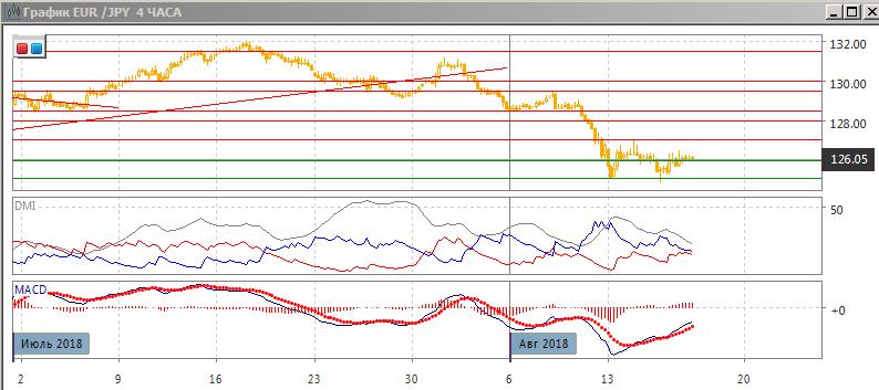 На четырёхчасовом графике пара получила поддержку у минимума 13 августа. Пара находится примерно в середине диапазона 125,10-127,00. Пара выросла от 125,10 после образования бычьего расхождения минимумов пары и гистограммы MACD, однако у 126,00 рост приостановился, и предыдущего максимума у 127,00 пара не достигла. Учитывая сохранение тенденции снижения, более вероятным кажется движение к предыдущим минимумам около 125,10.