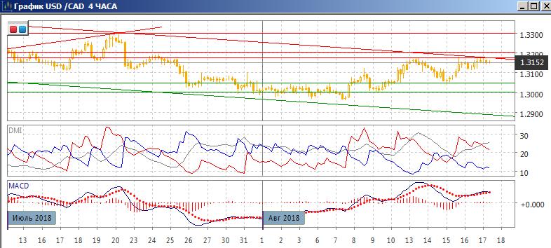 На четырёхчасовом графике пара откатывается при приближении к линии тренда и уровню 1,3200, у 1,3175 образовалось три относительных максимума. При этом относительные минимумы пары растут. Это создаёт направленный вверх треугольник, из которого пара должна сейчас выйти. ADX тенденция роста является сильно: превышение DM+ над DM- большое. Обозначило бы переход к снижению в краткосрочной перспективе преодоление уровня 1,3100 — он кажется ближайшей сильной поддержкой. Преодоление уровня 1,3175 и линии тренда открыло бы пространство для роста пары до следующего «круглого» уровня на 1,33.