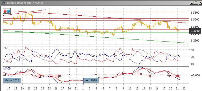 На четырёхчасовом графике пара преодолела поддержку на 1,3050, и минимумы 14-15 и 17 августа. Снижение ниже 1,1350 можно рассматривать и как преодоление промежуточного минимума двойной вершины у 1,3180. Исходя из размера модели в 130 пунктов целью может быть уровень 1,2920. По индикаторам направленного движения тенденцией стало снижение: DM- выш DM+, разрыв увеличивается, ADX в отрицательной зоне, линия MACD имеет отрицательный наклон.