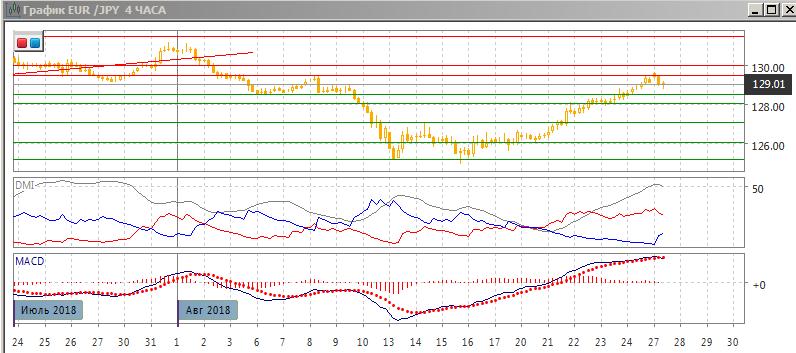 На четырёхчасовом графике пара растёт, но рост постепенно замедляется, это видно по образованию медвежьего расхождения максимумов пары и гистограммы MACD. Образование этого расхождения увеличивает вероятность отката. В этом масштабе пара вышла из зоны перекупленности по RSI. При откате поддержку можно ожидать на 128,50 (поддержка в начале августа и уровень 50% коррекции к снижению). Последовательность роста относительных максимумов и минимумов пары не нарушена, по ADX тенденция роста сильная.
