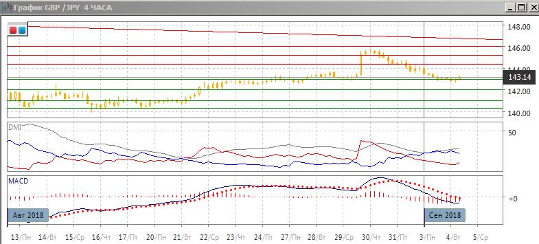 На четырёхчасовом графике пара вернулась к уровню, от которого произошёл резкий скачок на прошлой неделе. Относительное минимумы и максимумы пары теперь снижаются. По индикаторам направленного движения тенденцией стало снижение: DM- выше DM+, гистограмма MACD в отрицательной зоне, линия MACD имеет отрицательный наклон. Рассчитывать на дальнейшее снижение стоит после преодоления уровня поддержки на 143,00 (в конце августа уровень показал себя сильным сопротивлением/поддержкой).