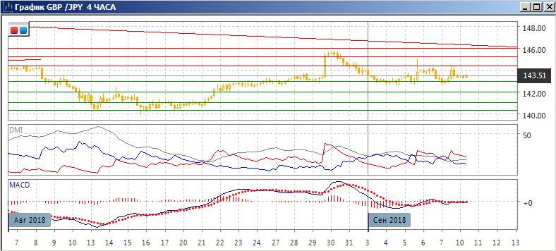 На четырёхчасовом графике диапазон выражен более явно, только здесь он уже: 143-144,40. Пара находится сейчас у нижней границы диапазона. В рамках движения в диапазоне кажется более вероятным движение к верхней границы после приближения к нижней. По индикаторам направленного движения флэт: DM- и DM+ пересекаются, гистограмма MACD около нуля, линия MACD также почти горизонтальна.