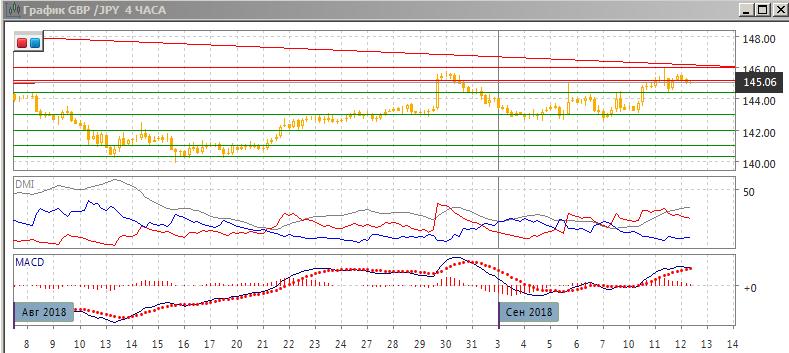 На дневном графике пара выросла от уровня 143,00 до максимума конца августа у 146,00. Также пара приблизилась к нисходящей линии тренда, если строить его с середины апреля. По индикаторам направленного движения тенденцией стал рост: гистограмма в положительной зоне, линия MACD имеет положительный наклон, превышение DM+ над DM- увеличивается. Если пара преодолеет уровень 146, она также преодолеет и линию нисходящего тренда, что потенциально может привести к существенному росту.