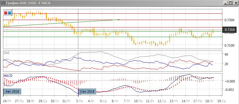 На четырёхчасовом графике коррекция от 0,7235 завершилась, пара почти вернулась к исходной точке коррекции, и скорее он будет тестироваться. У 0,7235 может образоваться медвежье расхождение максимумов пары и гистограммы MACD, что укрепляет сопротивление на этом уровне. По ADX пара примерно во флэте: DM+ и DM- теперь близки, гистограмма MACD около нуля, линия MACD близка к горизонтали. При преодолении 0,7235 рост скорее продолжится.