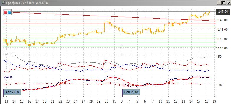 На дневном графике рост продолжился после преодолении линии нисходящего тренда с середины апреля и преодоления максимума августа около 146,00. Сейчас пара приблизилась к максимумам начала июня, но более сильное сопротивление видится только на 150,00, что и видится следующей целью. После преодоления линии тренда. По индикаторам направленного движения тенденция роста усиливается: превышение DM+ над DM- увеличивается, ADX растёт. Гистограмма MACD остаётся в положительной зоне, линия MACD сохраняет положительный наклон. Образовалось медвежье расхождение максимумов пары и гистограммы MACD, но этот сигнал не подтверждается.