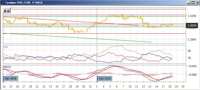 На дневном графике пара получила поддержку на важном с психологической точки зрения уровне 1,3000, и у верхней линии нисходящего канала с конца июня. Однако отскок вверх от этой зоны поддержки ограничивается сейчас уровнем сопротивления 1,3050. По индикаторам направленного движения сейчас скорее флэт: ADX находится на довольно низком уровне, DM- и DM+ чередуются со второй половины июля. Продолжение движения будет скорее в направлении выхода пары из флага между 1,3000 и 1,3050. При выходе вниз целью будет видеться уровень 1,2890 — около минимума августа. На четырёхчасовом графике остановка в диапазоне 1,3000 и 1,3050 видна лучше. Сейчас пара снижается от верхней границы и вероятно будет тестированию нижнюю на 1,3000.