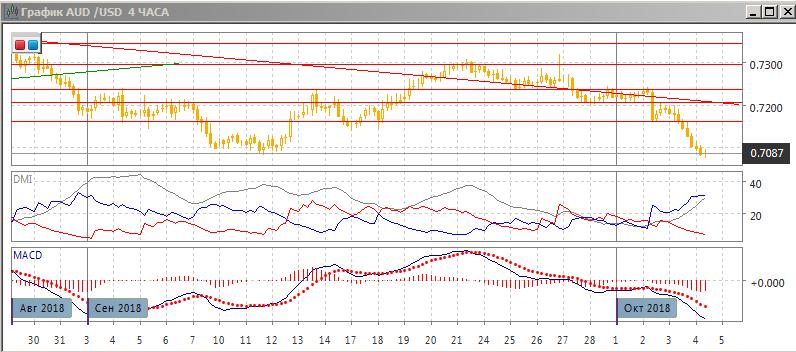 На четырёхчасовом графике снижение усиливается и признаков разворота пока нет. Снижение резко ускорилось после выхода пары вниз из консолидации 0,7200-0,7235. После выхода пара получила поддержку на 0,7135, что было уровнем поддержки в начале сентября. При отскоке пара встретила сопротивление на 0,7200, на ранее преодолённом уровне поддержки, после чего снижение возобновилось. Пара достигла нового долговременного минимума 4 октября, ниже минимума 11 сентября. По индикаторам направленного движения тенденция снижения усилилась: превышение DM- над DM+ увеличилось, ADX на высоком уровне и растёт, линия MACD имеет отрицательный наклон, гистограмма MACD снижается в отрицательной зоне. Более вероятно, что пара будет снижаться до сильной поддержки на 0,7000.